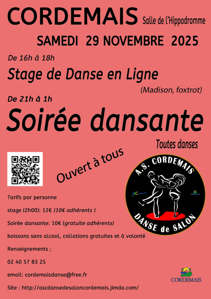 La section danse de salon organise le samedi 29 novembre 2025, un stage de Danse en ligne ( Madison & foxtrot) de 16h à 18h suivi d’une soirée dansante de 21h à 1h (toutes danses).